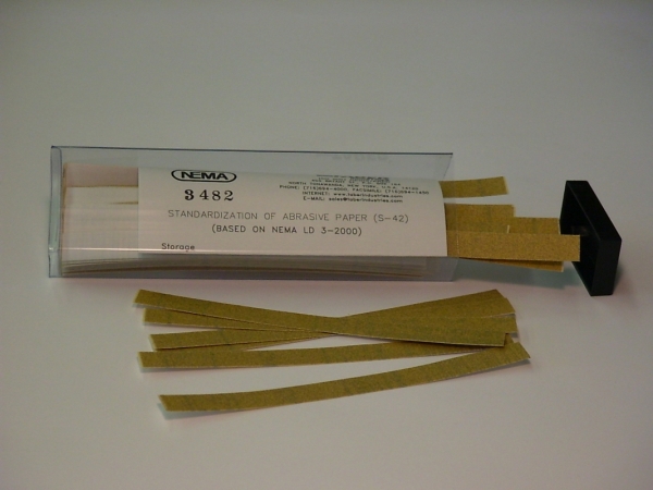 S-42 砂紙 - S-42 砂紙由非常精細(xì)的氧化鋁砂粒組成,分級為180 ANSI-CAMI,平均粒徑約為78μm(0.00304英寸)。 為了保持磨損率,必須在規(guī)定數(shù)量的測試循環(huán)(通常為200或500)之后更換砂紙條。常用于高壓裝飾層壓板,木地板,塑料,家具表面,油漆和清漆的磨耗測試。